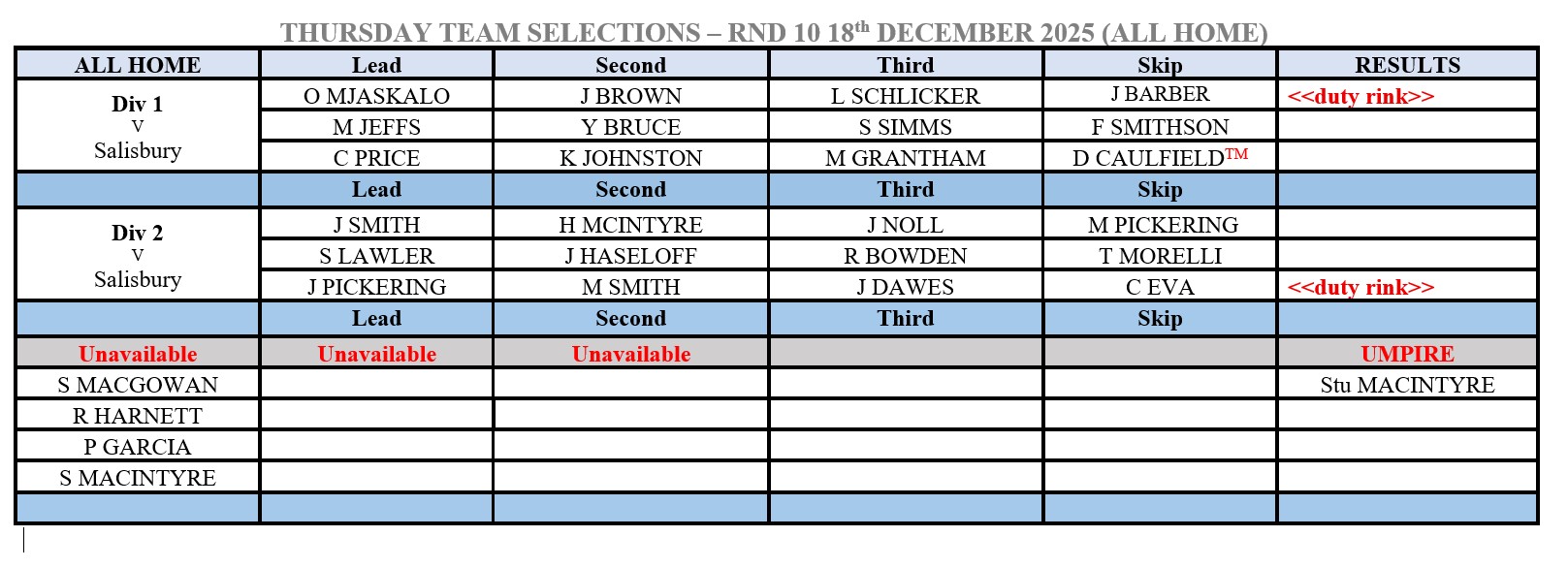 Round 10: Thursday 18th December