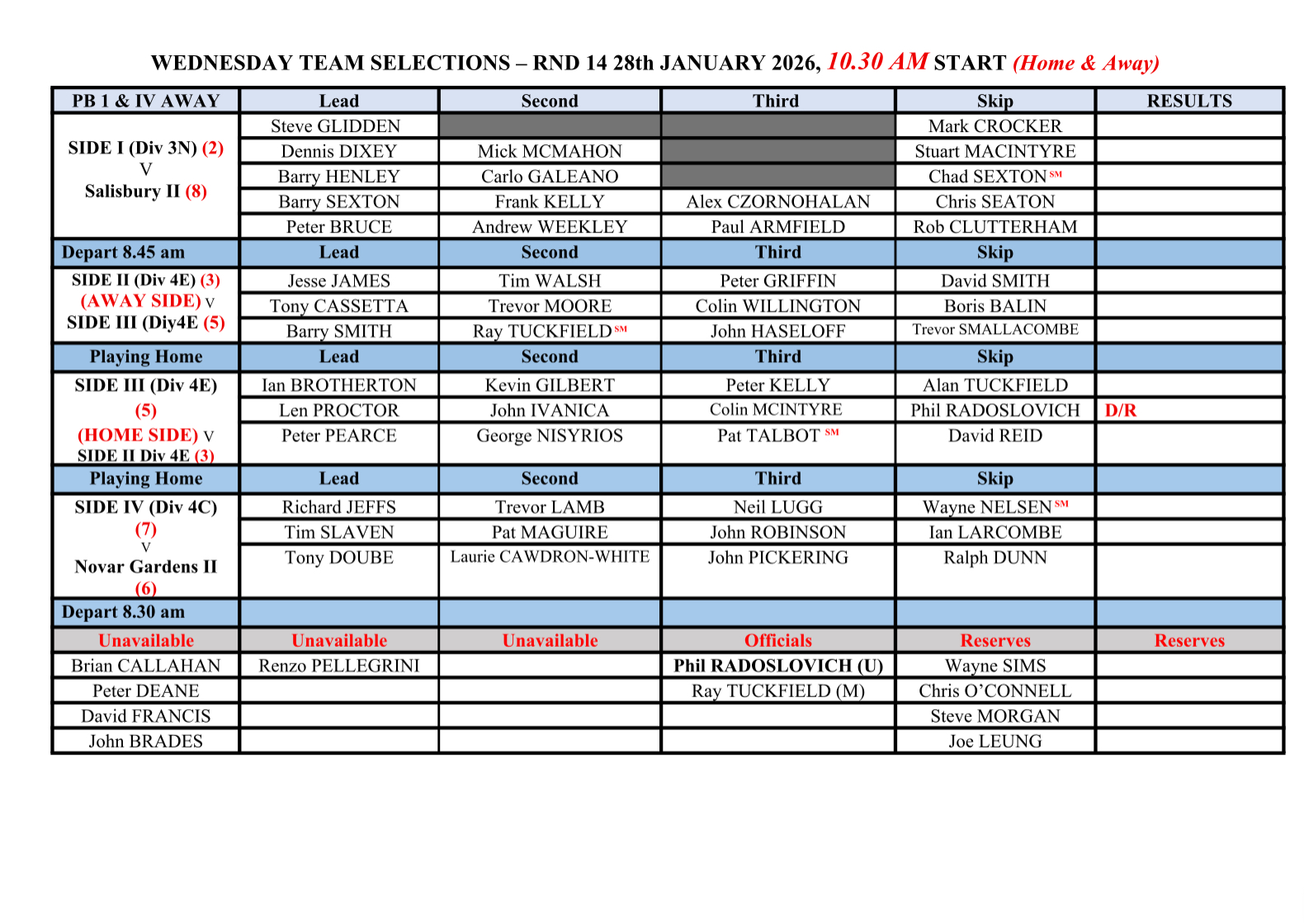 Round fourteen – 28th January 2026 RESULTS DIVISION 3N Team 1 DIVISION 4E Team 2 & 3 DIVISION 4C Team 4
